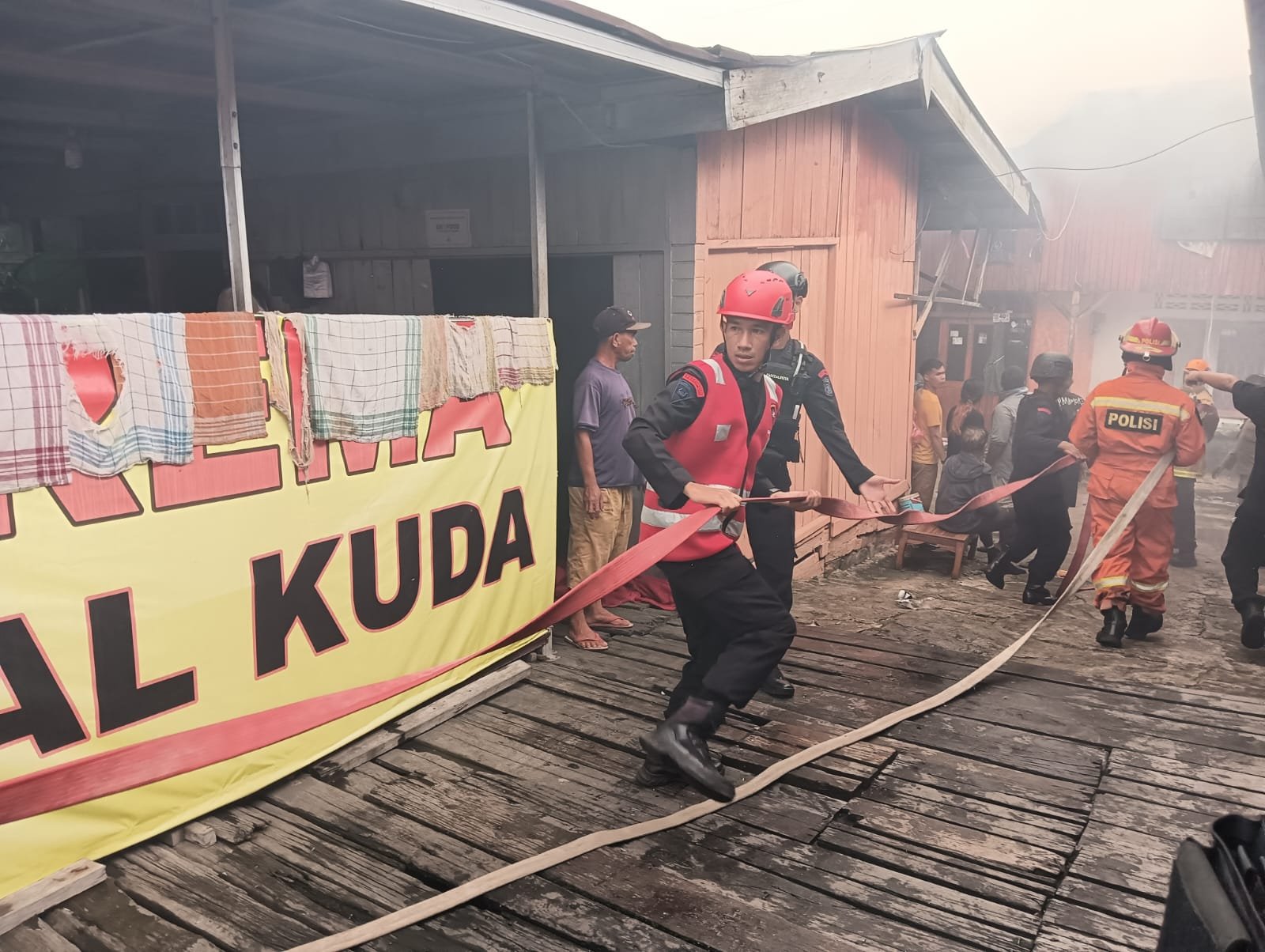 Tim Respon Bencana Satuan Brimob Polda Kaltim Bersama BPBD dan warga ikut membantu padamkan api kebakaran yang menghanguskan dua bangunan rumah kayu tepat di belakang warung nasi goreng arema.