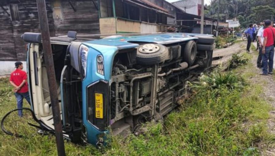 Mobil Bus Pariwisata bernopol B-7798-BAA membawa rombongan Pemda DKI Terguling di Pasar Lumbanjulu, Kabupaten Toba, Sumut Jumat (17/05/2024).