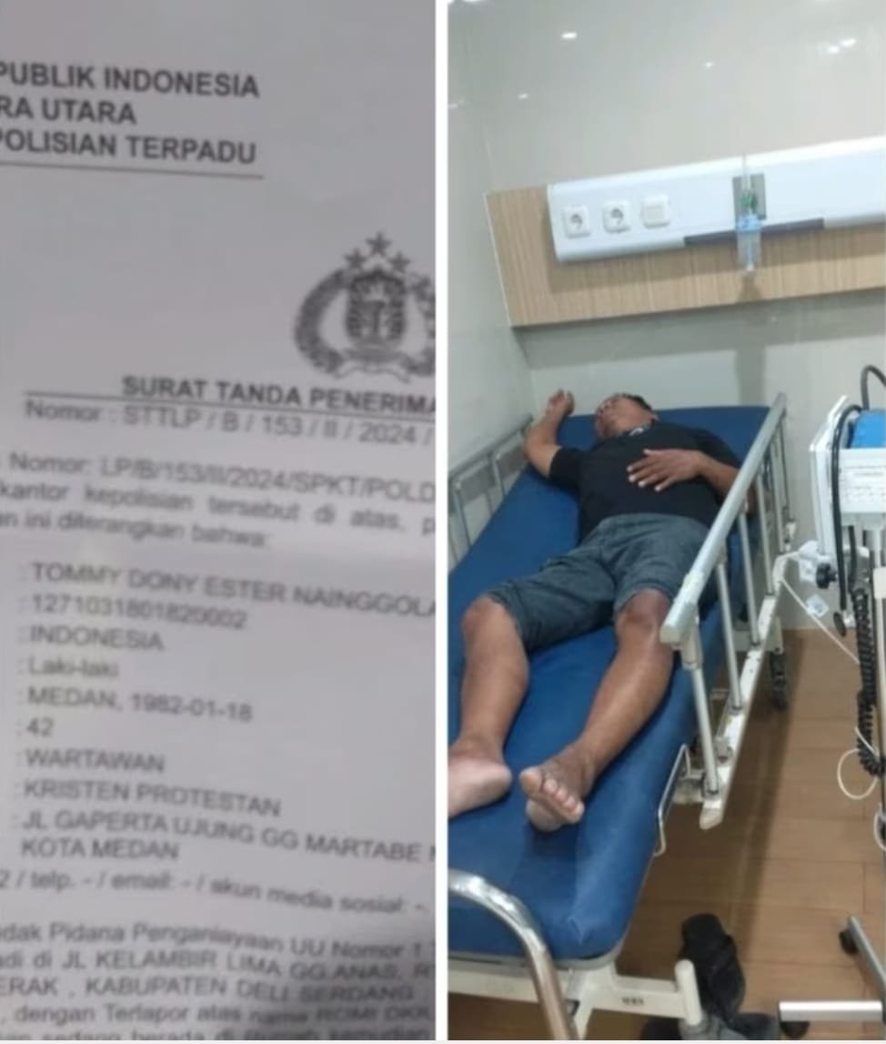 Seorang wartawan media tobapos bernama Tomy (40) warga Jalan Gaperta Ujung, Helvetia, Kota Medan, diserang 3 orang pria saat berada di rumah kerabatnya di Jalan Kelambir Lima, Gang Anas, Deli Serdang. Kamis (8/2/2024).