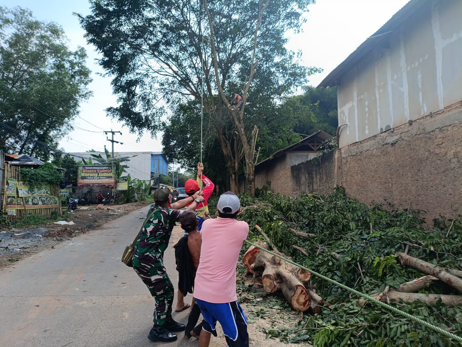 Babinsa Cibening Bersama Masyarakat Potong Pohon Rawan Listrik