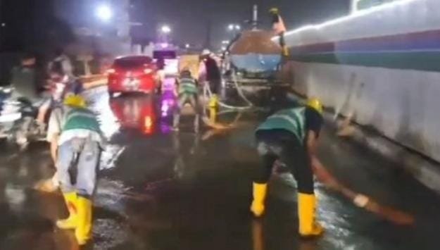 Untuk diketahui para pekerja membersihkan dengan cara menyiram air ke badan jalan.