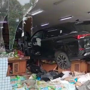 Ngeri! Mobil “Terbang” Tabrak Swalayan Total Buah Segar di Pegadungan, Kalideres