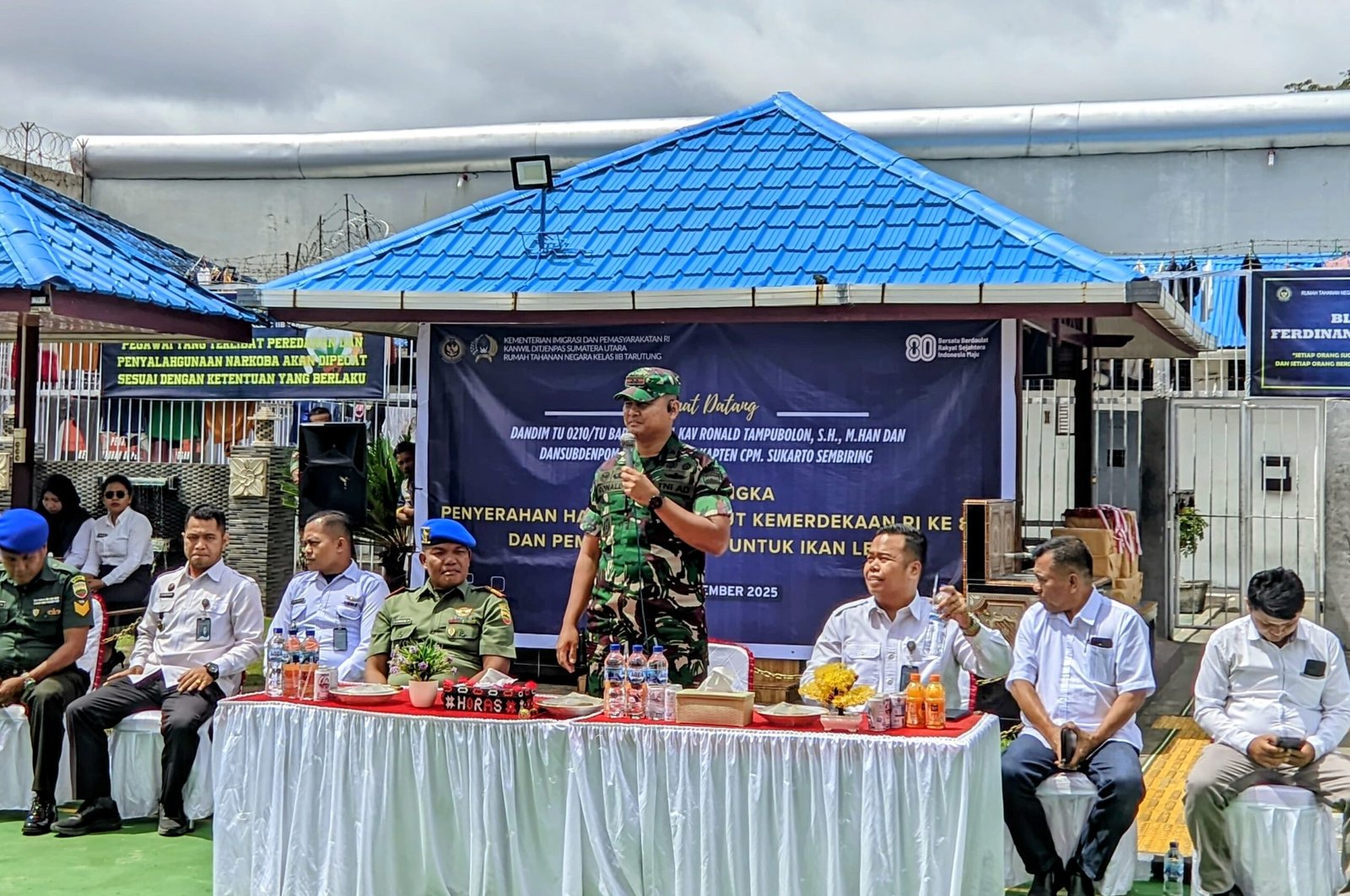 Dalam sambutannya, Ka Rutan Evan Yudha Putra Sembiring menyampaikan rasa hormat atas kehadiran Dandim dan berharap kegiatan serupa dapat rutin digelar setiap Senin dengan mengundang Dandim dan Kapolres Taput. “Suatu kehormatan bagi kita Pak Dandim hadir memberikan hadiah dalam rangka HUT RI. Mari kita doakan beliau cepat naik pangkat menjadi Jenderal,” ujar Evan dengan penuh semangat.