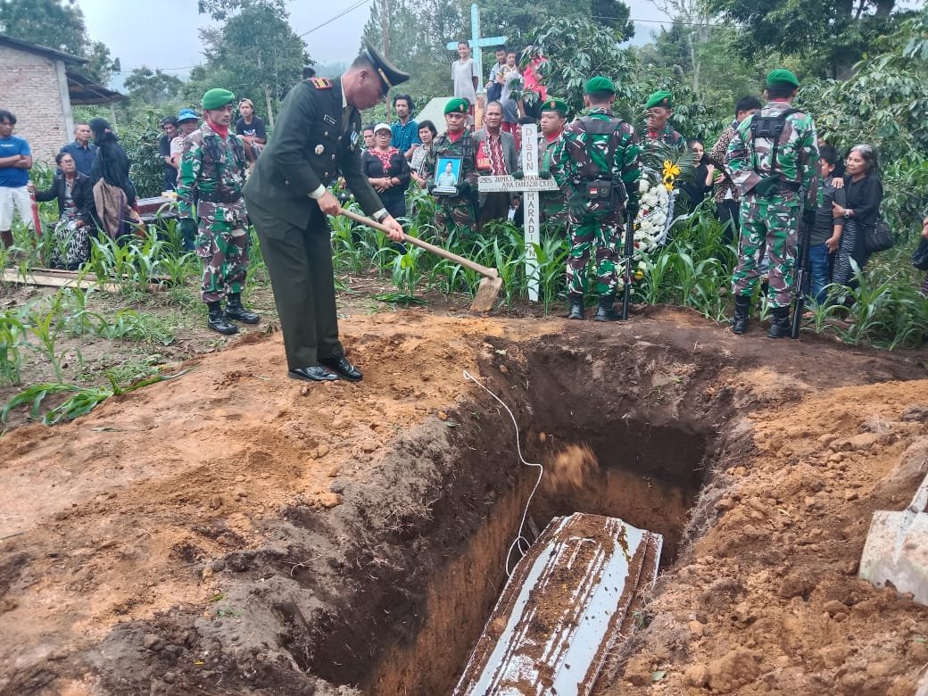 Radarjakarta.id | TAPUT – Danramil 22/Tarutung Kapten Inf Jonny Lumbantoruan beserta anggota melaksanakan Upacara Pemakaman militer anggota Kodim 0107/Aceh Selatan An. Kopda Jumri Efendi Simanungkalit karena sakit bertempat di dusun Garaga Kel. Situmeang Habinsaran Kec. Sipoholon Kab. Taput, Senin (25/9/2023).