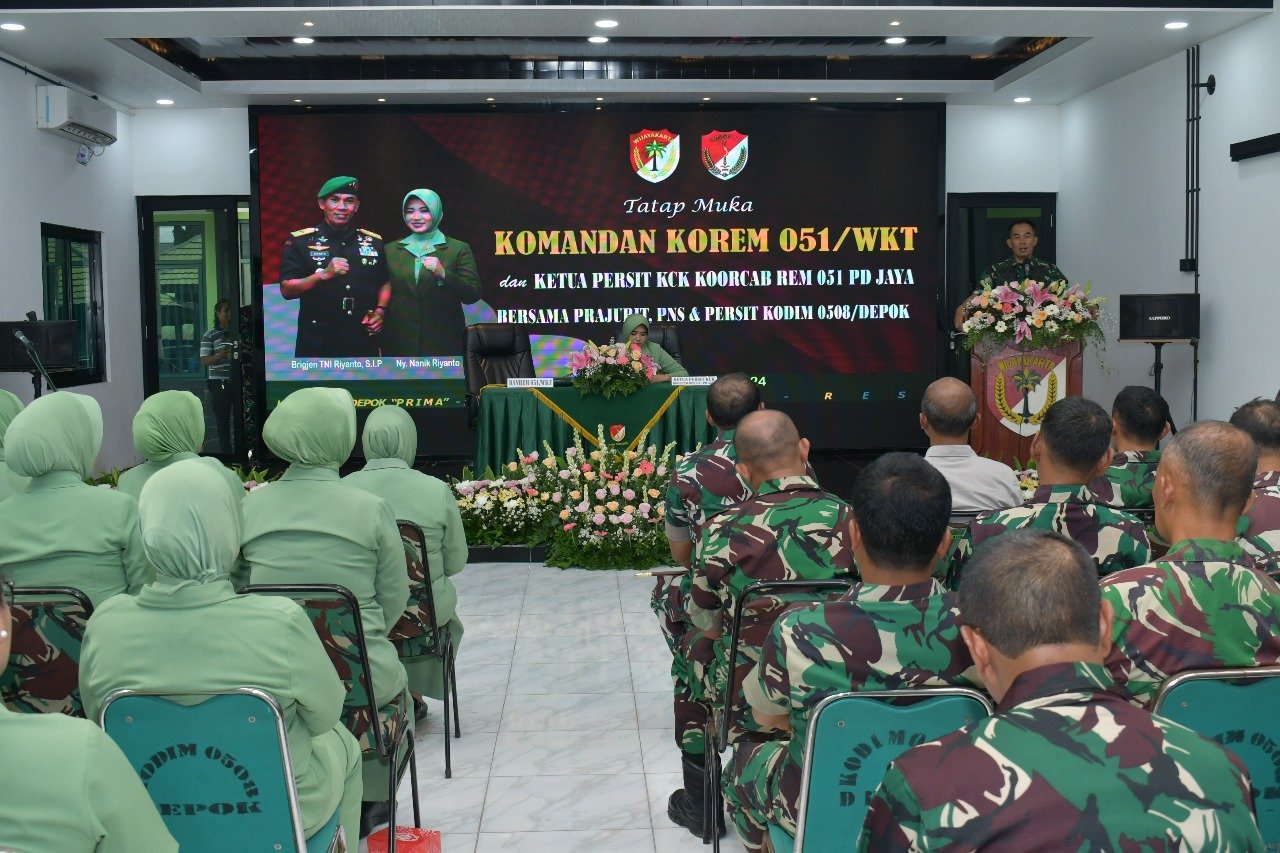 Radarjakarta.id | DEPOK – Komandan Korem 051/WKT, Brigjen TNI Riyanto S.I.P, bersama Ketua Persit Kartika Chandra Kirana Koorcab Rem 051 PD Jaya Ny. Nanik Riyanto, tatap muka dihadapan para prajurit, Pegawai Negeri Sipil (PNS), dan anggota Persit Kodim 0508/Depok.