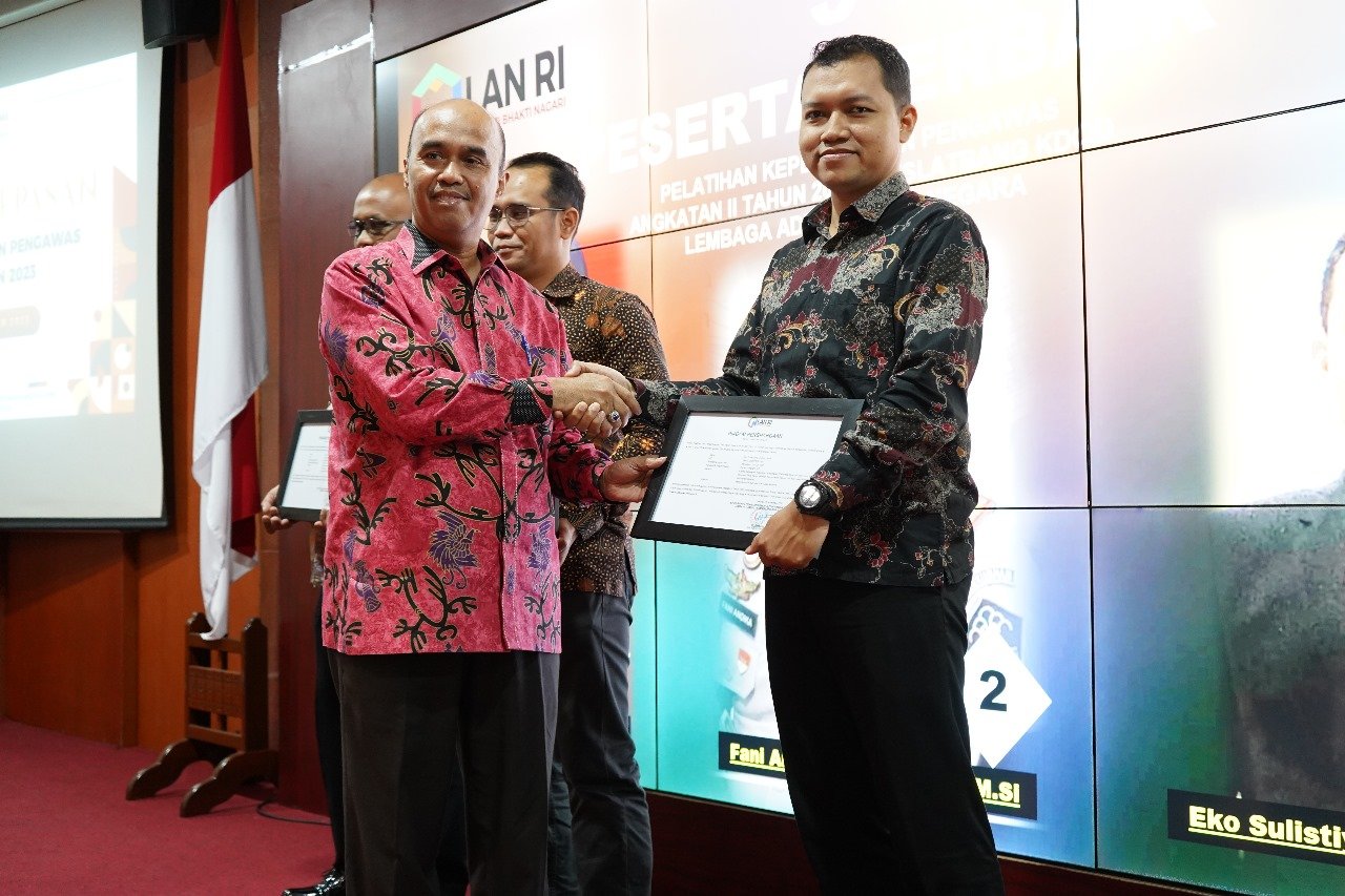 Sebanyak 40 orang peserta Pelatihan Kepemimpinan Pengawas Angkatan II tahun 2023 dilepas secara resmi oleh Kepala Puslatbang KDOD LAN Dr. Muhammad Aswad, M.Si pada hari Rabu (22/11) di Ruang Auditorium Puslatbang KDOD LAN. Seluruh peserta yang berasal dari Kementerian Hukum dan HAM ini dinyatakan lulus dan berhak untuk mendapatkan Sertifikat Kelulusan, dengan kualifikasi Sangat Memuaskan sebanyak 12 orang, dan dengan kualifikasi Memuaskan sebanyak 28 orang.