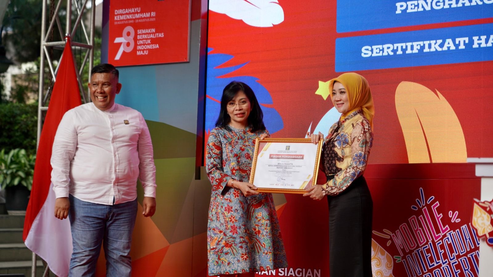 Dalam acara ini, Dirjen KI Min Usihen juga menyerahkan penghargaan kepada Atalia Praratya sebagai Ketua Dekranasda Jawa Barat dan Ikatan Keluarga Alumni Notariat Universitas Padjadjaran yang telah menjadi mitra pelayanan publik Kantor Wilayah Kementerian Hukum dan HAM Jawa Barat.