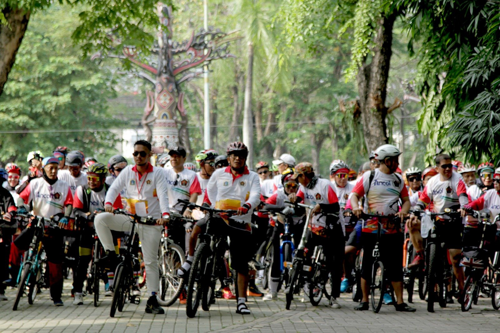 Momen kemeriahan sepeda santai Pokja PWI Wali Kota Jakarta Utara, Minggu (1/9/2024) saat finis di Pasar Seni, Ancol.