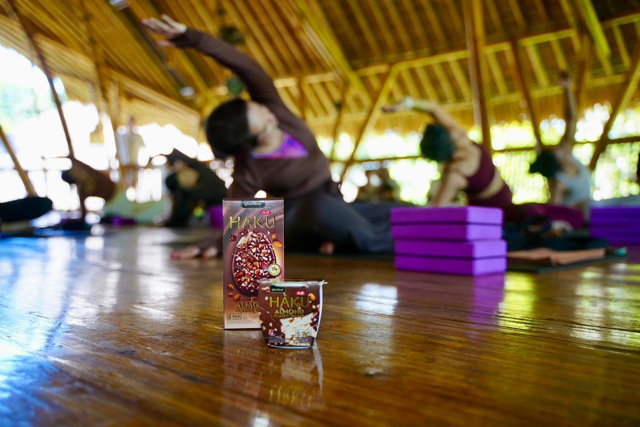 HAKU Almond Classic Deluxe menemani sesi Yoga Stay Zen Bareng HAKU untuk momen rileks sejenak. (Foto: Ist)