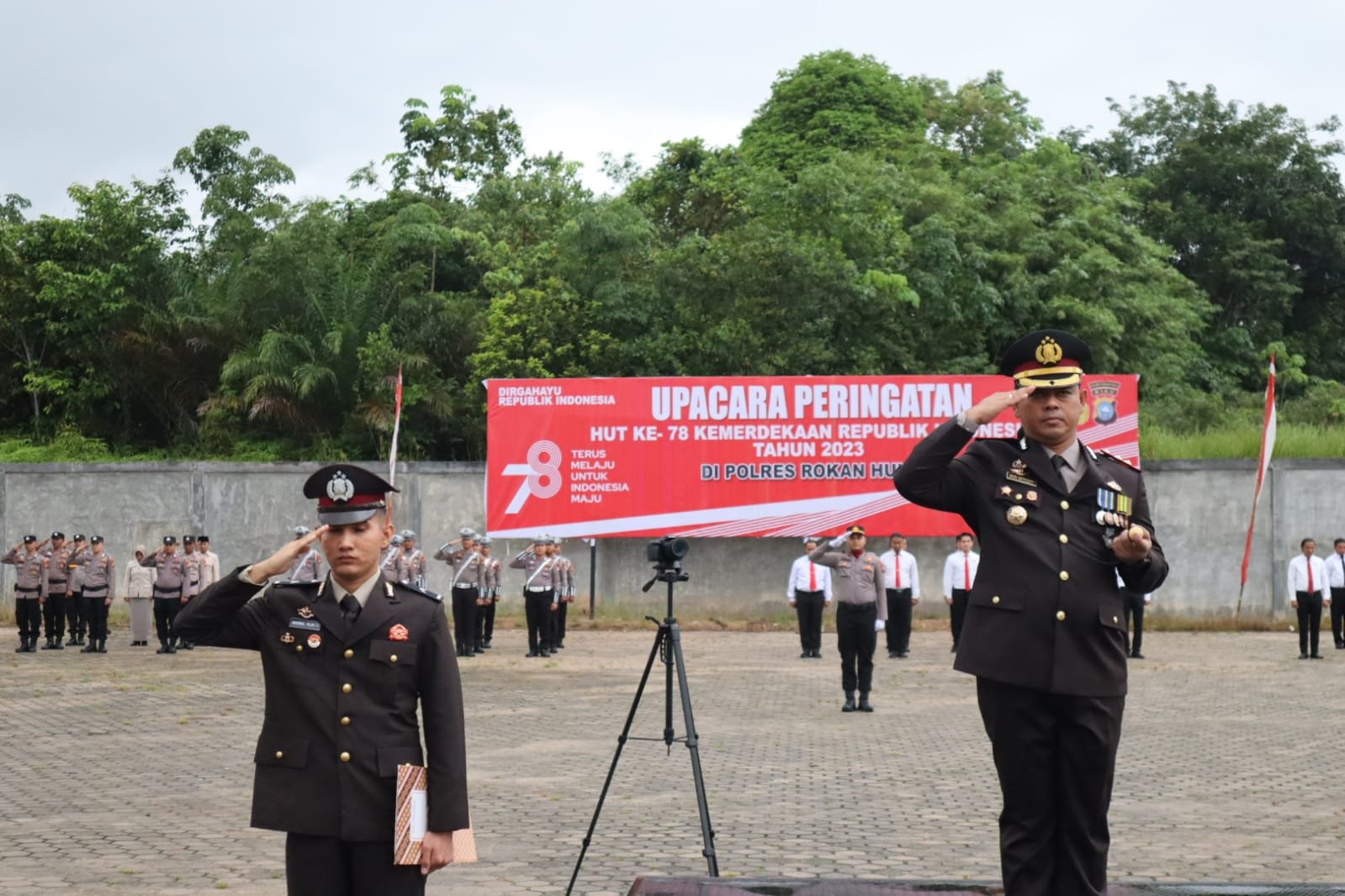 Bertindak sebagai Pejabat Upacara Peringatan HUT Ke 78 Kemerdekaan Republik Indonesia Tahun 2023, Inspektur Upacara Kapolres Rohul AKBP Budi Setiyono SIK MH, Perwira Upacara AKP Awaluddin, Komandan Upacara Ipda Abdau Wardiyoso STr K, Pembawa Acara Briptu Selly Wahyuni, Pembaca Doa Aiptu Zulpandi S Pd I.