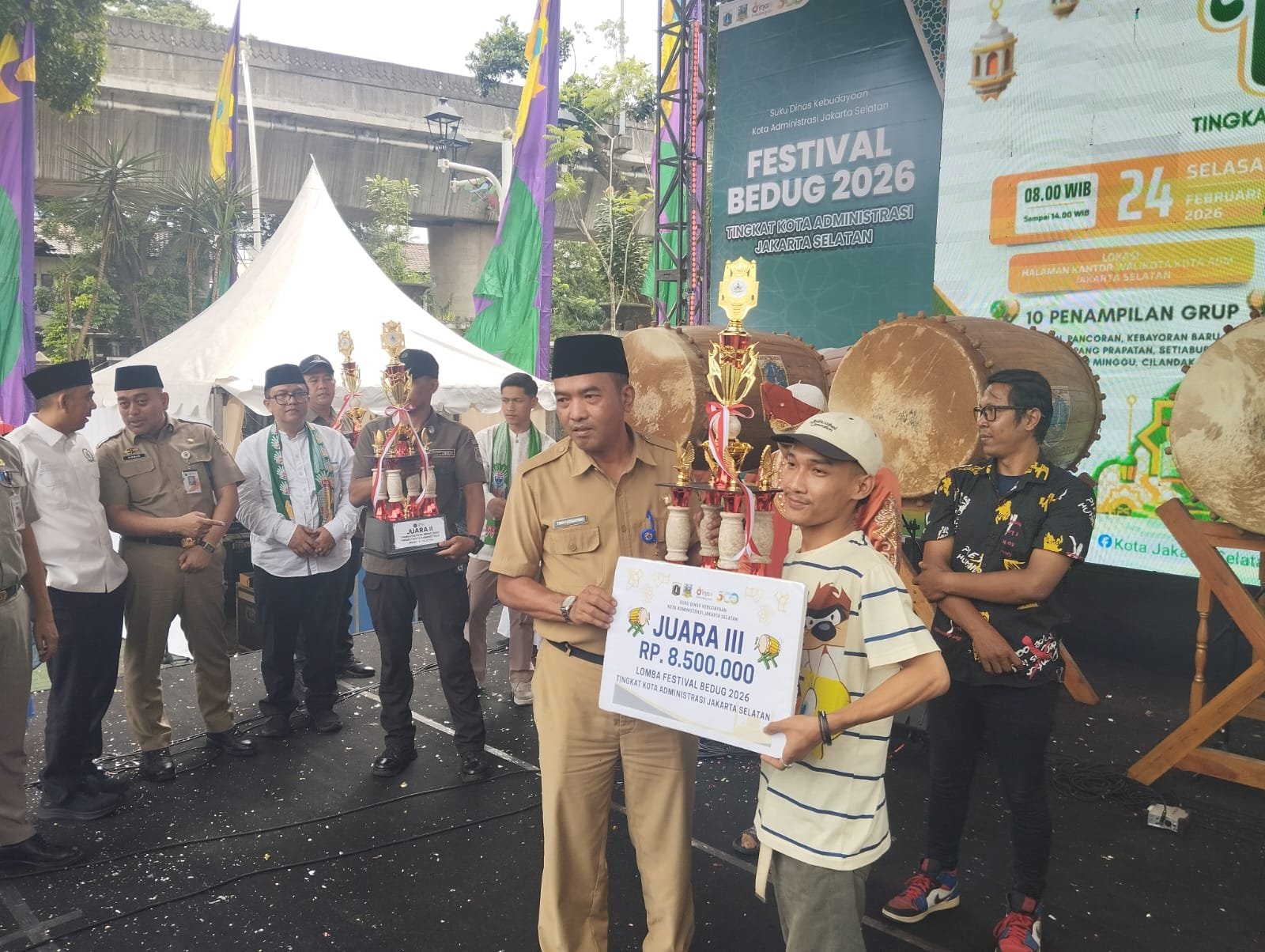 JAKARTA, Radarjakarta.id-Walikota Administrasi Jakarta Selatan, M Anwar, menyerahkan hadiah para juara Festival Bedug 2026 Tingkat Kota Administrasi Jakarta Selatan (Jaksel), di Halaman Kantor Walikota Administrasi Jakarta Selatan, Selasa (24/2).
