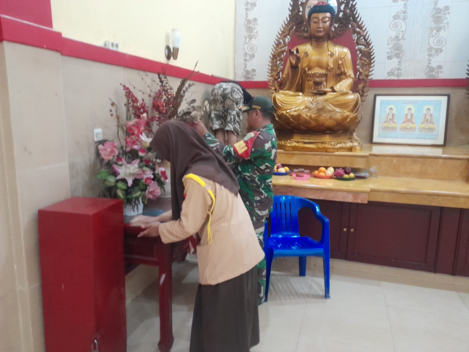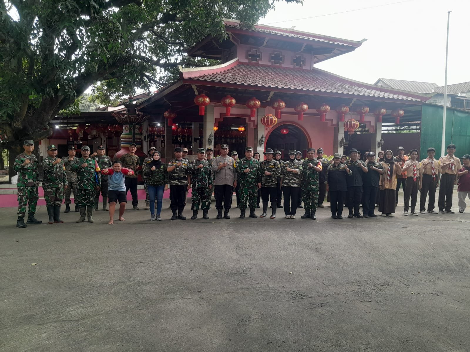 Suasana gotong royong tampak hangat dan penuh kebersamaan. Warga dan aparat bahu-membahu membersihkan lingkungan rumah ibadah agar siap menyambut perayaan Imlek dengan suasana yang bersih dan nyaman.