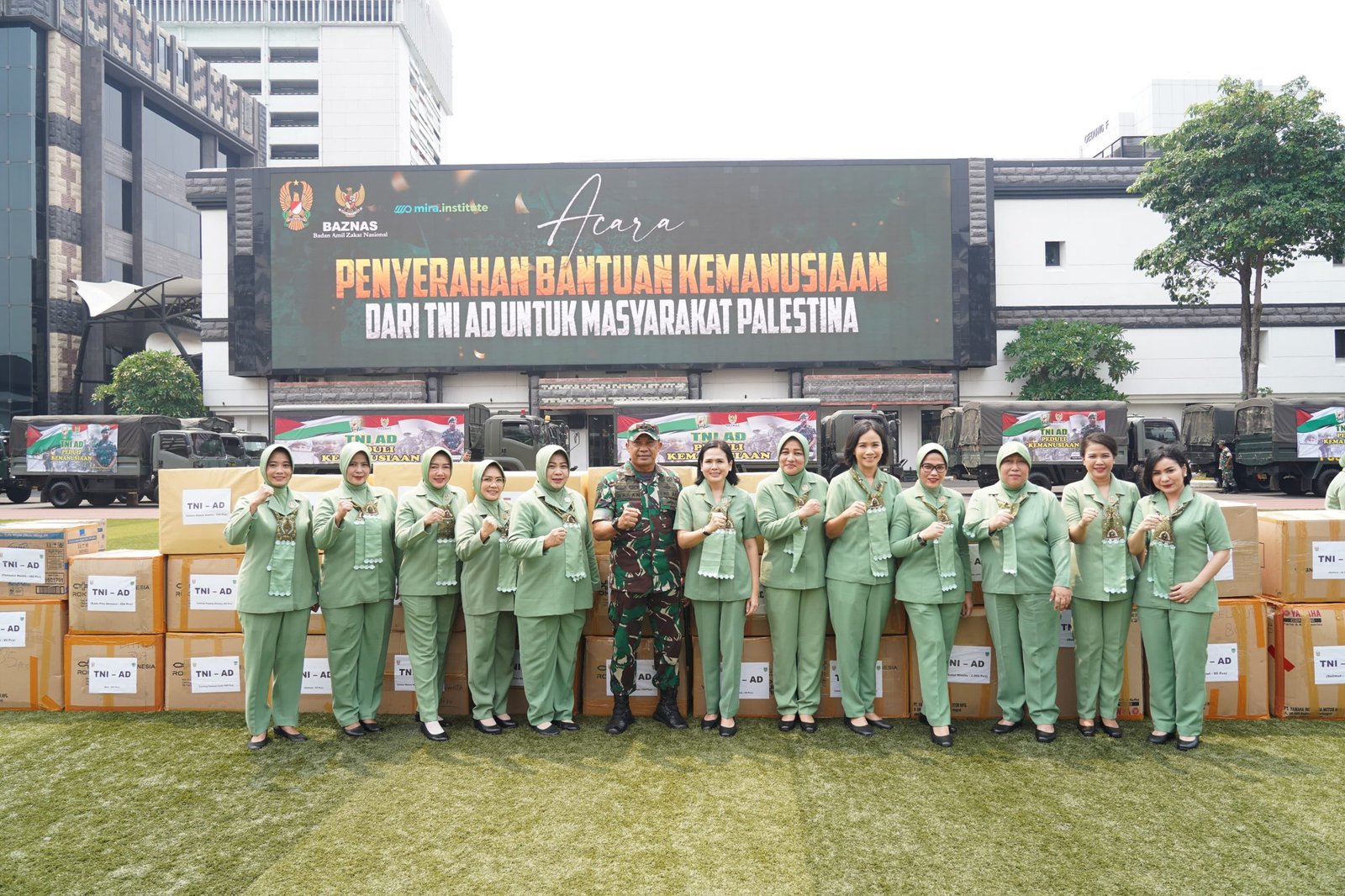 Kepala Staf Angkatan Darat Jenderal TNI Agus Subiyanto, S.E., M.Si., didampingi Ketua Umum Persit KCK Ny. Evi Agus Subiyanto memimpin penyerahan bantuan kemanusiaan untuk masyarakat palestina.