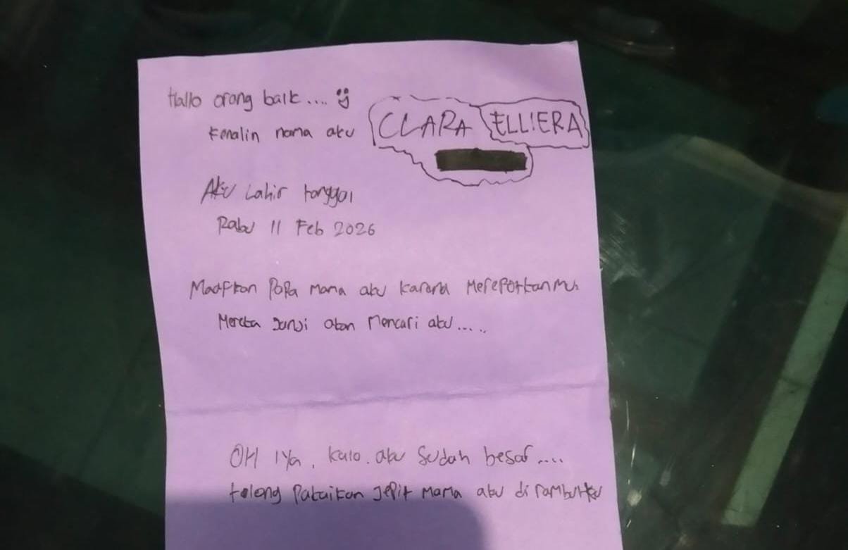 Dalam surat tersebut, tertulis pesan yang berisi nama bayi, Clara Elliera, serta permohonan maaf dan harapan agar bayi tersebut dirawat dengan baik. “Hallo Orang Baik kenalin nama aku CLARA ELLIERA aku lahir tanggal Rabu 11 Feb 2026. Maafkan papa mama aku karena merepotkanmu mereka janji akan mencari aku… oh iya, kalau aku sudah besar… Tolong pakaikan jepit mama aku di rambut” .