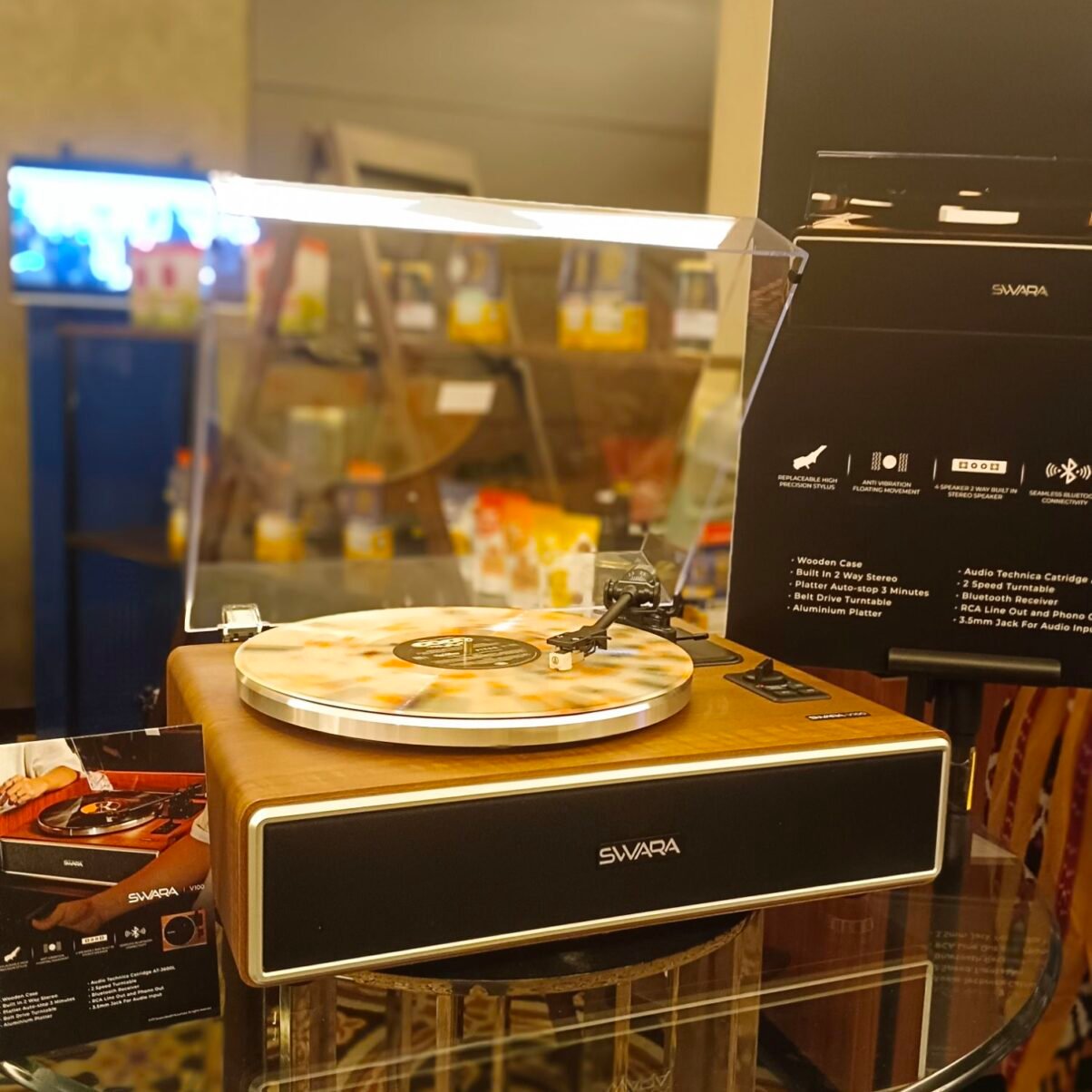 Selain itu, produk lokal juga unjuk gigi melalui SWARA V100, sebuah turntable dengan bodi kayu elegan dan konektivitas Bluetooth modern. Dilengkapi cartridge Audio-Technica AT-3600L, sistem speaker stereo built-in, serta desain anti-getar, produk ini menjadi bukti bahwa karya anak bangsa mampu bersaing dengan brand global di ranah audio premium.