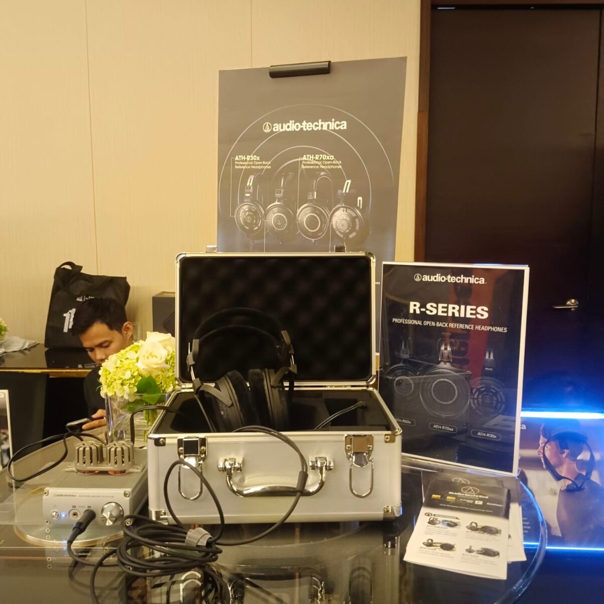 Di area pameran, berbagai produk unggulan menarik perhatian pengunjung. Audio-Technica, misalnya, menampilkan seri R (ATH-R70x dan ATH-R80x) headphone profesional open-back yang dirancang untuk referensi suara studio kelas dunia. Dengan desain elegan dan build quality khas Jepang, booth Audio-Technica menjadi salah satu spot paling ramai dikunjungi.