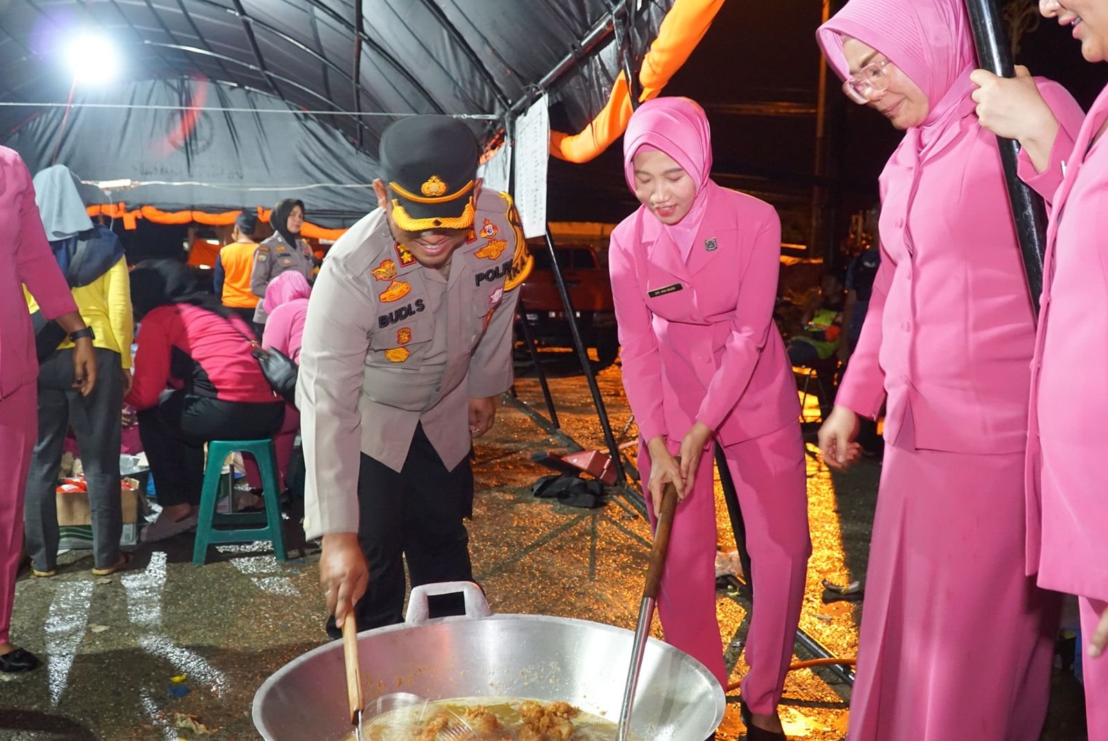 Tampak, di dampingi, Ibu Ketua Bhayangkari Cabang Rohul Ny Ina Budi, Kapolres AKBP Budi, melakukan pemberian Bansos untuk Masyarakat terdampak Banjir, akibat luapan Sungai Batang Lubuh di tenda dapur umum BPD Jl Tuanku Tambusai Kelurahan Pasir Pengaraian Kecamatan Rambah Minggu (31/12/2023) sekitar pukul 18.45 Wib.