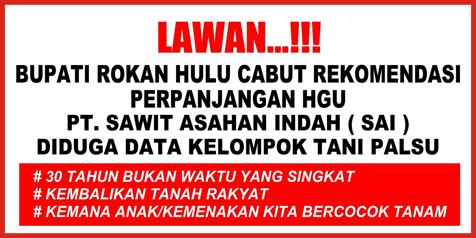 Adapun, kutipan kalimat di dalam spanduk tersebut, ” Lawan..! Bupati Rokan Hulu Cabut Rekomendasi perpanjangan HGU PT Sawit Asahan Indah (SAI) Diduga Data Kelompok Tani Palsu, #30 Tahun Bukan Waktu Yang Singkat, #Kembalikan Tanah Rakyat, #Kemana Anak-Kamanakan Kita Bercocok Tanam”