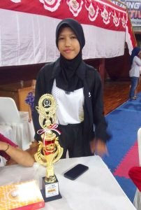 “Alhamdulillah…saya menang di pertandingan bertemu lawan yang sangat berat. Meski saya sempat jatuh ke lantai karena didorong keras oleh lawan tapi akhirnya saya yang menang,” ujar Kirana Sofiyani berbinar memegang Piala.
