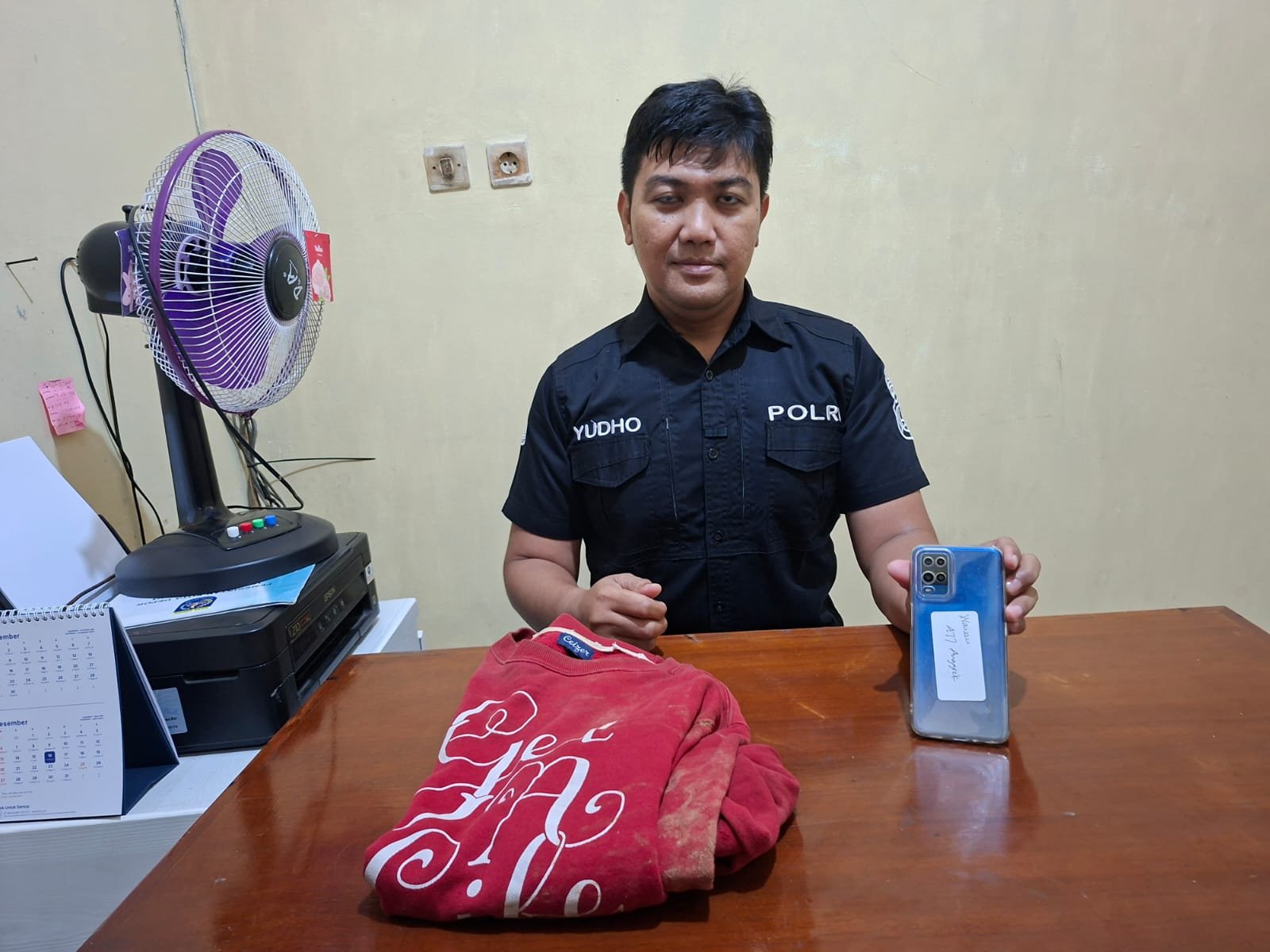 Polisi menyita barang bukti berupa satu unit ponsel Oppo A54 warna biru milik korban serta satu potong sweater merah yang dipakai pelaku saat beraksi.