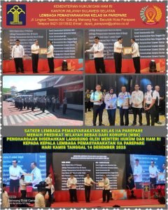 Lembaga Pemasyarakatan Kelas IIA Parepare pada Kantor Wilayah Kementerian Hukum Dan HAM Sulawesi Selatan menerima penghargaan sebagai Satuan Kerja Berpredikat Wilayah Bebas Dari Korupsi (WBK) Tahun 2023 dari Menteri Hukum dan HAM RI. Kamis, ( 14/12/2023).