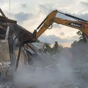 Markas ormas GRIB Jaya yang berdiri di atas tanah milik BMKG digulung habis oleh aparat gabungan.