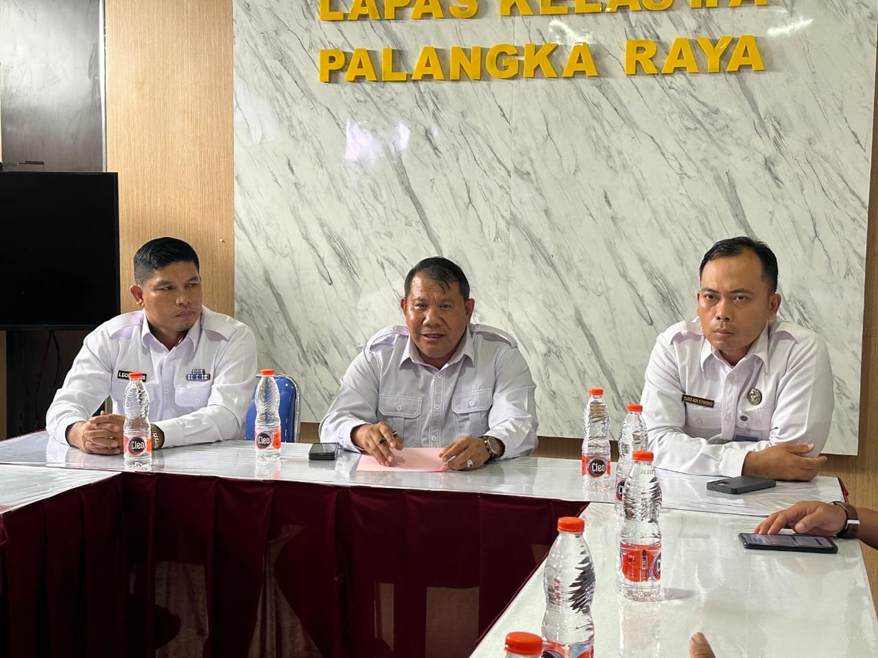 Kakanwil Direktorat Jenderal Pemasyarakatan (Kakanwil Ditjenpas) Kalimantan Tengah, I Putu Murdiana (tengah) didampingi oleh Kepala Bidang Pelayanan dan Pembinaan, Leonard Silalahi, Kepala Bagian Tata Usaha dan Umum, Yudo Adi Yuwono.