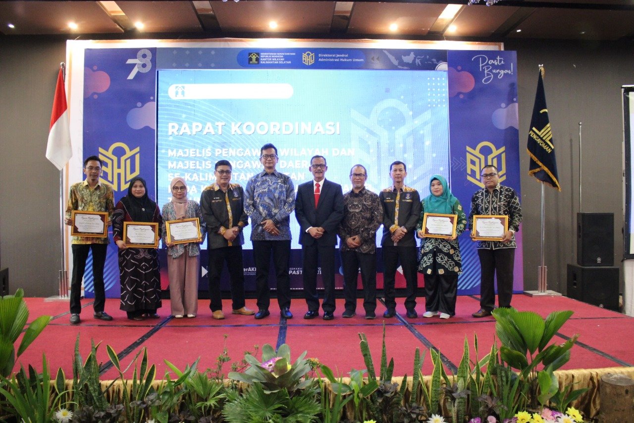 Dilanjutkan penyerahan piagam penghargaan Notaris berprestasi dalam rangka Pembinaan dan Pengawasan Notaris Tahun 2023 yang diserahkan oleh Kakanwil kepada MPDN Kabupaten Tabalong, M. Johan, S.H.; MPDN Kota Banjarbaru, Dr. H. Bachrudin, S.H., M.Kn.; MPDN Kota Banjarmasin, Sri Siswanti, S.H., M.Kn.; MPDN Kabupaten Banjar, Arini Amalia, S.H., M.Kn.; dan MPDN Kabupaten Tanah Laut, Yayat Sufiatna, S.H., M.Kn.