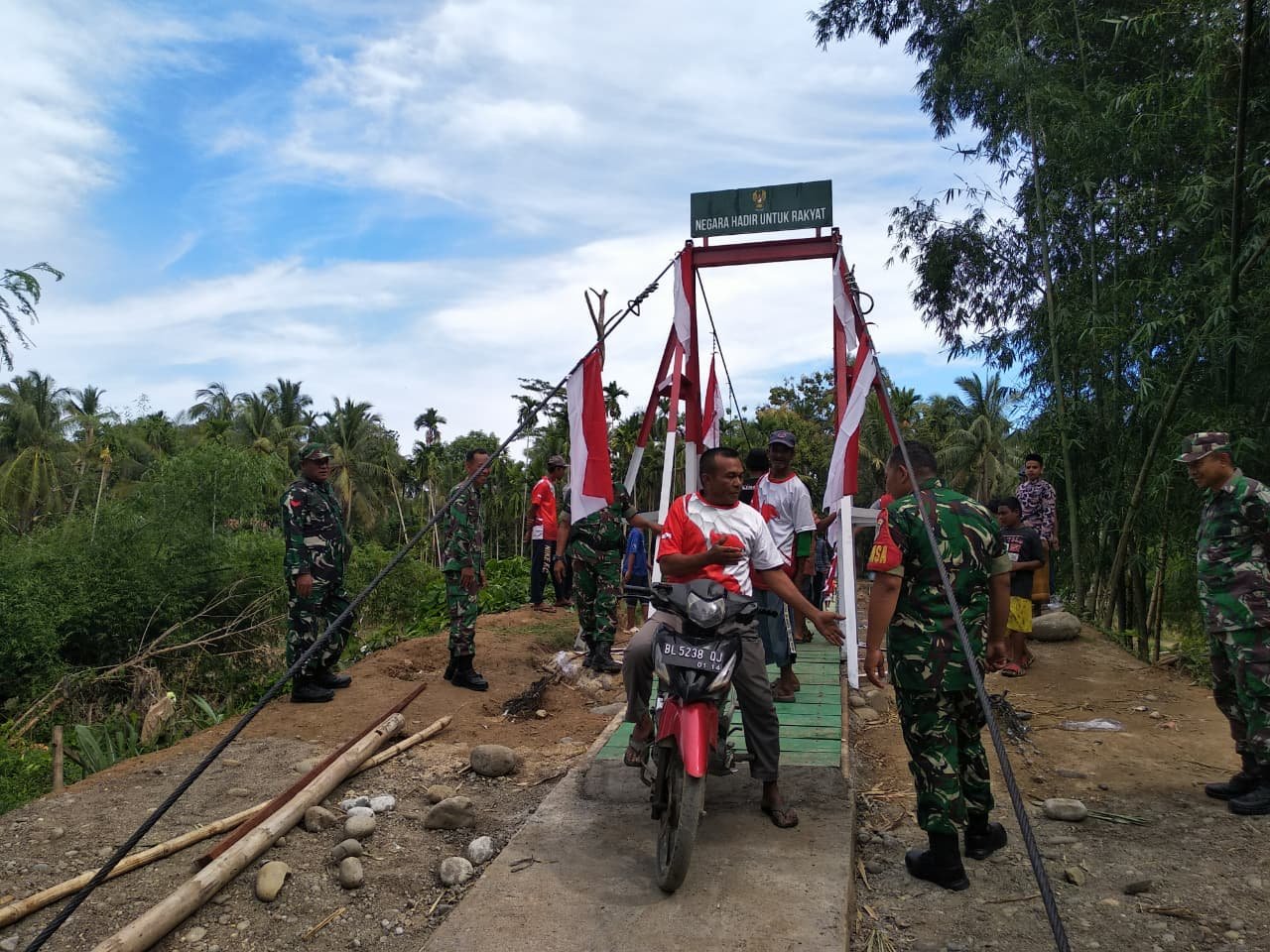 Jembatan gantung ini dibangun oleh prajurit Batalyon Zeni Tempur 5/Arati Bhaya Wighina dan Batalyon Zeni Tempur 17/Ananta Dharma sebagai wujud pengabdian TNI Angkatan Darat dalam membantu mengatasi kesulitan rakyat serta meningkatkan konektivitas antarwilayah yang sebelumnya terbatas akses transportasinya.