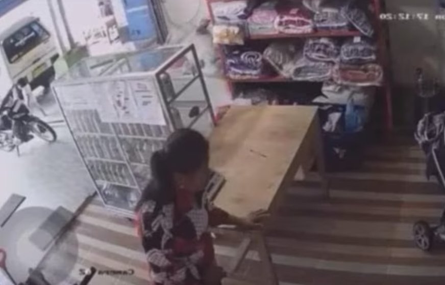 Seorang wanita yang diduga melakukan pemerasan itu terlihat mengenakan baju motif kombinasi merah, putih dan hitam. Dia tampak berdiri di bagian pintu masuk.
