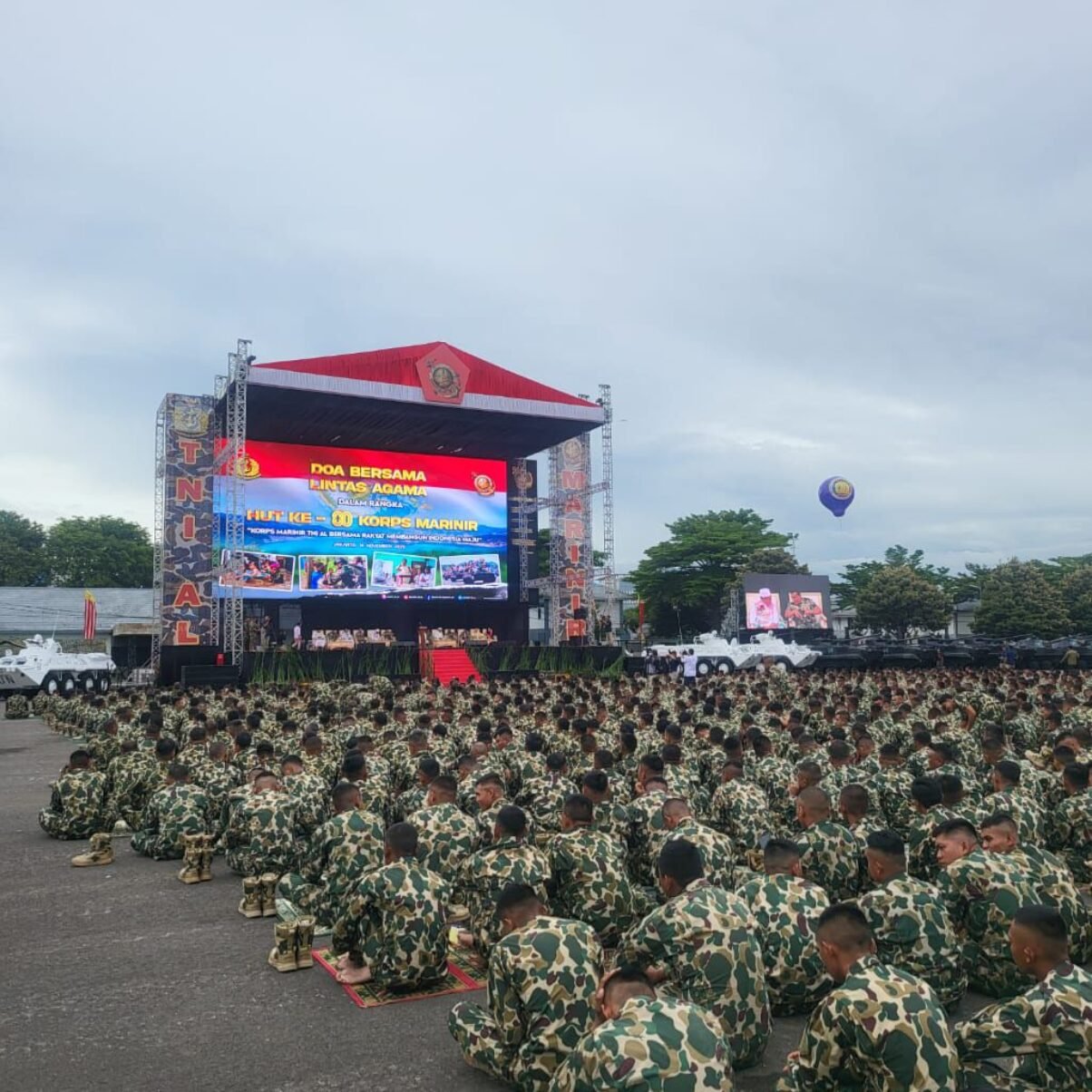 JAKARTA, Radarjakarta.id — Peringatan Hari Ulang Tahun ke-80 Korps Marinir TNI Angkatan Laut yang berlangsung di Lapangan Apel Brigif 1 Marinir, Cilandak, Jakarta Selatan, pada Jumat (14/11) berjalan khidmat dan penuh nuansa persatuan. Kegiatan ini menghadirkan Doa Bersama Lintas Agama yang melibatkan para tokoh agama dari berbagai keyakinan sebagai simbol kerukunan dan kebersamaan dalam menjaga keutuhan bangsa.